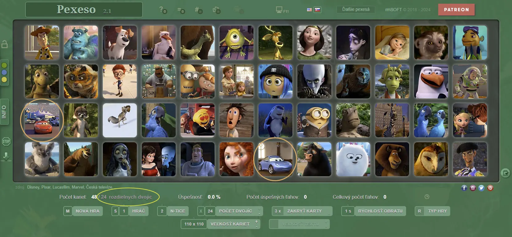 Tu som ale zistil, že by bolo fajn rozšíriť funkcionalitu pexesa tak, aby bolo možné hľadať viacero obrázkov z tej istej rozprávky... Paráda!... Už len vymyslieť algoritmus, ktorý bude ponúkať túto voľbu na viacero spôsobov... 😅 Vzniklo pexeso s rozdielnymi pármi kariet... [obr. 3]