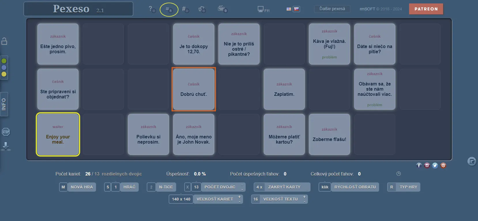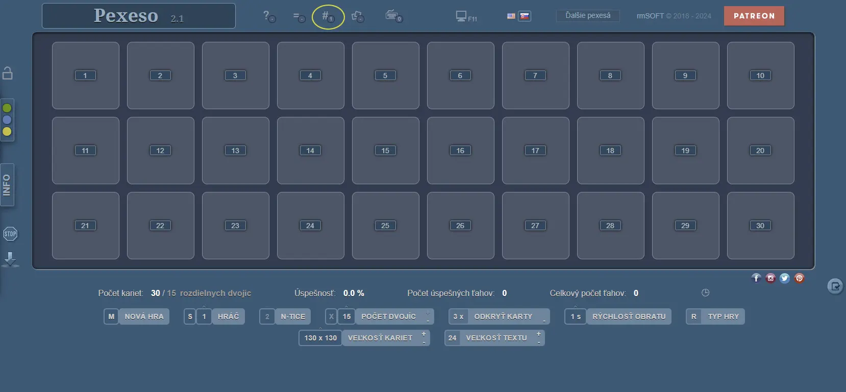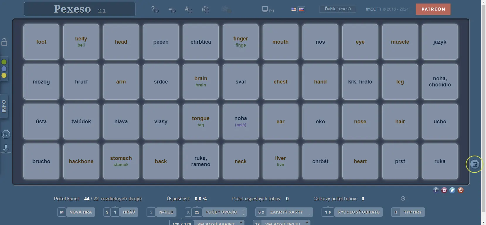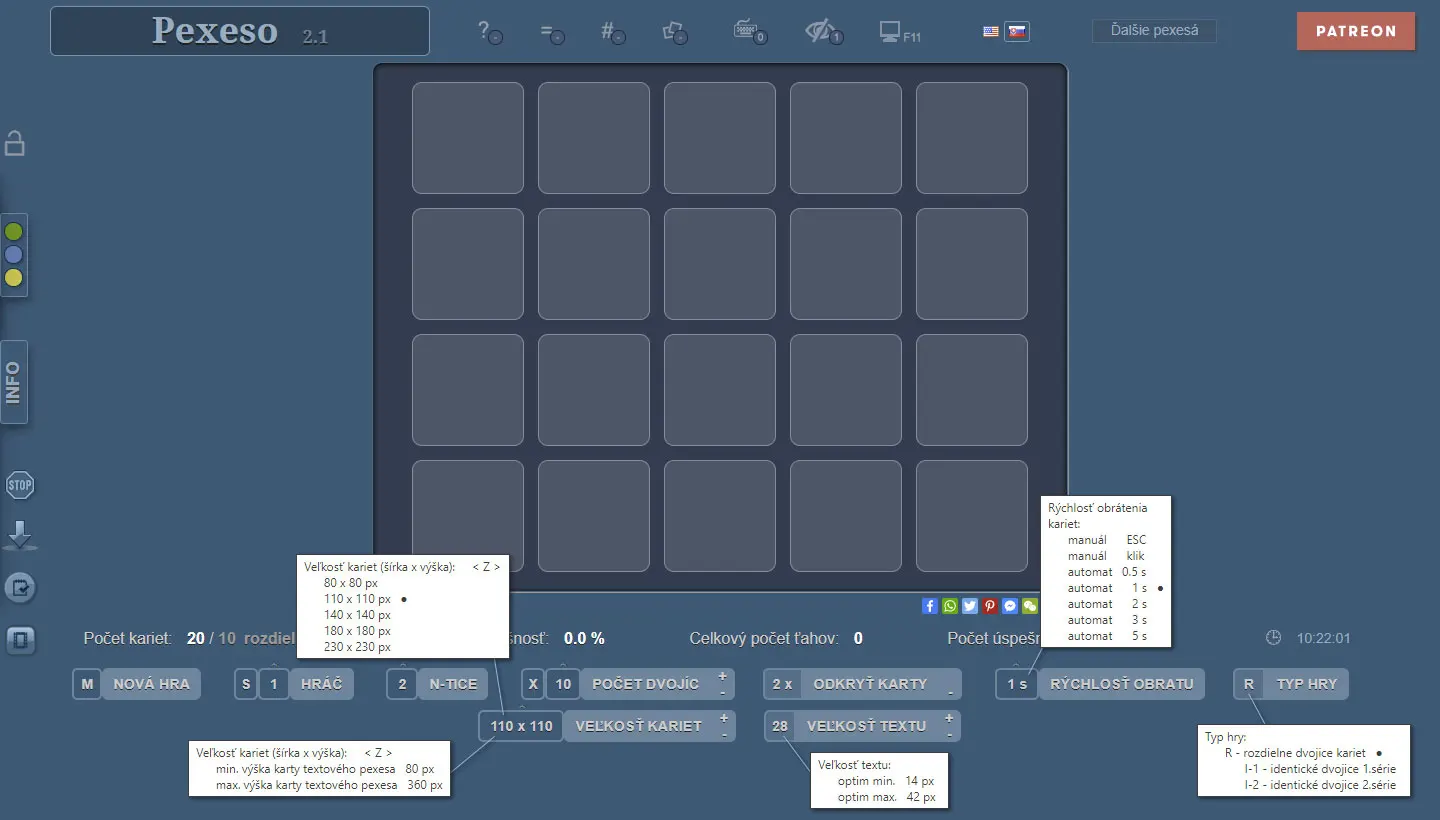 Navyše, pexeso je možné spustiť v slovenskej, ale aj anglickej mutácii - (klávesová skratka < G >). Samozrejme, ak by bol záujem, nie je problém vytvoriť ďalšiu jazykovú mutáciu.