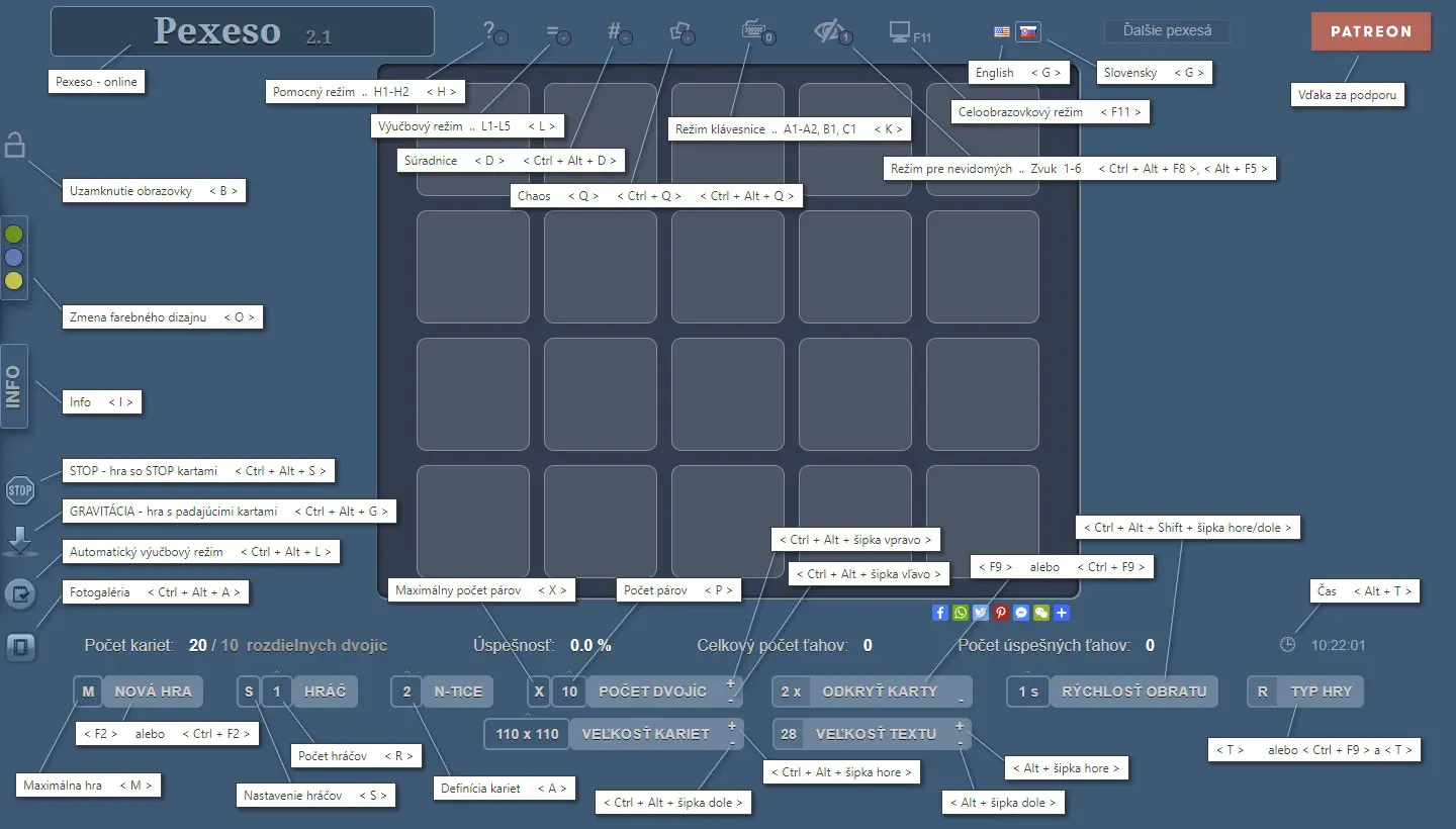 To, ako sa pexeso ovláda klávesnicou, je zdokumentované v sekcii klávesových skratiek - Info... (klávesová skratka < I >)